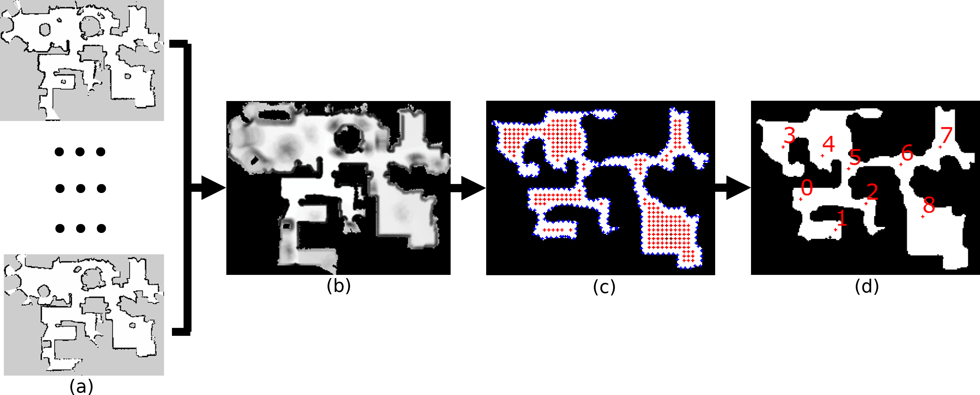 A general overview of our method. (a) The sequence of maps collected inside the same environment with different configurations. (b) The cost map obtained by aggregating all the maps. (c) The possible positions the robot can reach (red points) to perceive the locations in the boundaries of the free space (blue points). (d) The optimal subset of locations selected by our algorithm and the optimal path to reach them.