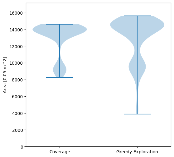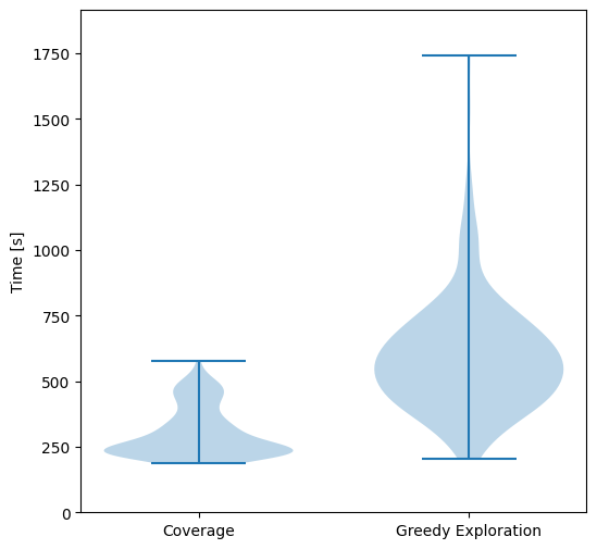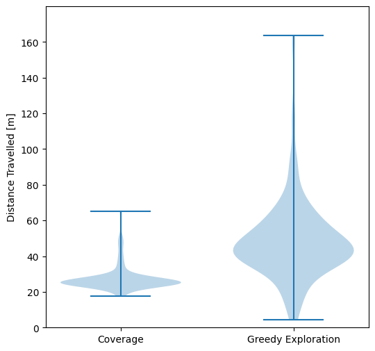 We tested this approach against the greedy frontier-based exploration strategy in simulation (using Stage). We generated 100 variants of the same environment with different obstacle configurations, and we run exploration and coverage for each of them. The results show that the exploration path extracted by our algorithm improves the exploration activity by reducing the travelled distance and the time to carry out the task.